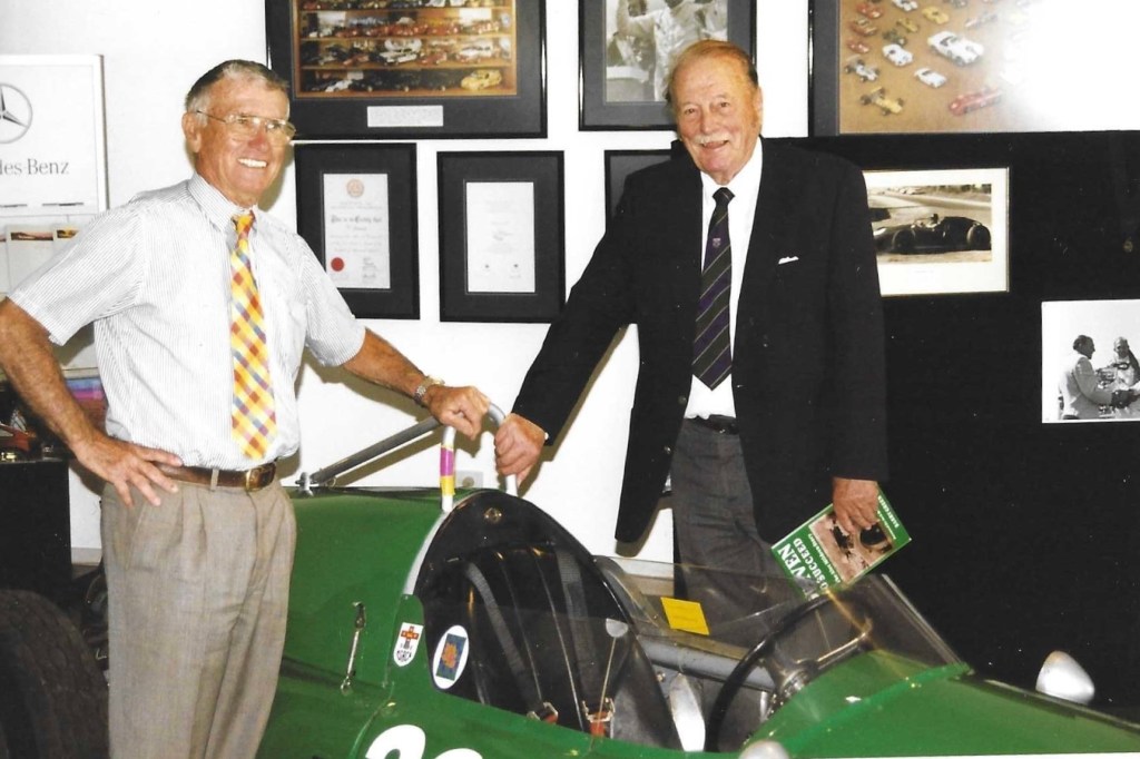 Racers both: Charlie Smith and John Crouch at the launch of Alec Mildren’s biography at Frank Gardner’s Norwell, Gold Coast facility on April 18, 1999.