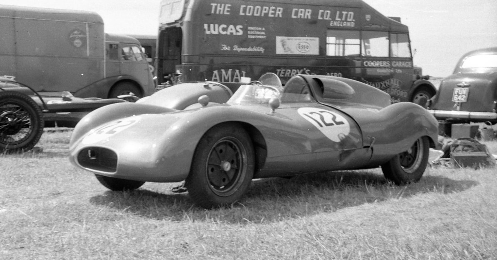 The car in the distance is the #55 Lotus Engineering Lotus 11 Climax which finished ninth, and first in the sports 750cc class, in the hands of Herbert Mackay-Fraser and Jay Chamberlain (below).