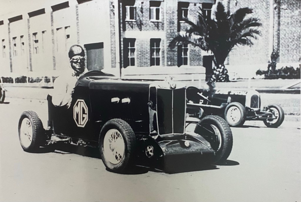 The Australian Midget Car Championship and Five Miles Amateur Car Championships followed at Penrith in April 1937, and shortly thereafter a major accident when a fellow competitor stalled right in front of him at the Sydney Showgrounds. “It was too late to avoid him, I crashed into his back axle, looped the loop and turned over three times. After that I can’t remember a thing, I was out to it for three days.” He recovered quickly despite a cracked skull, broken arm and injured thumb.