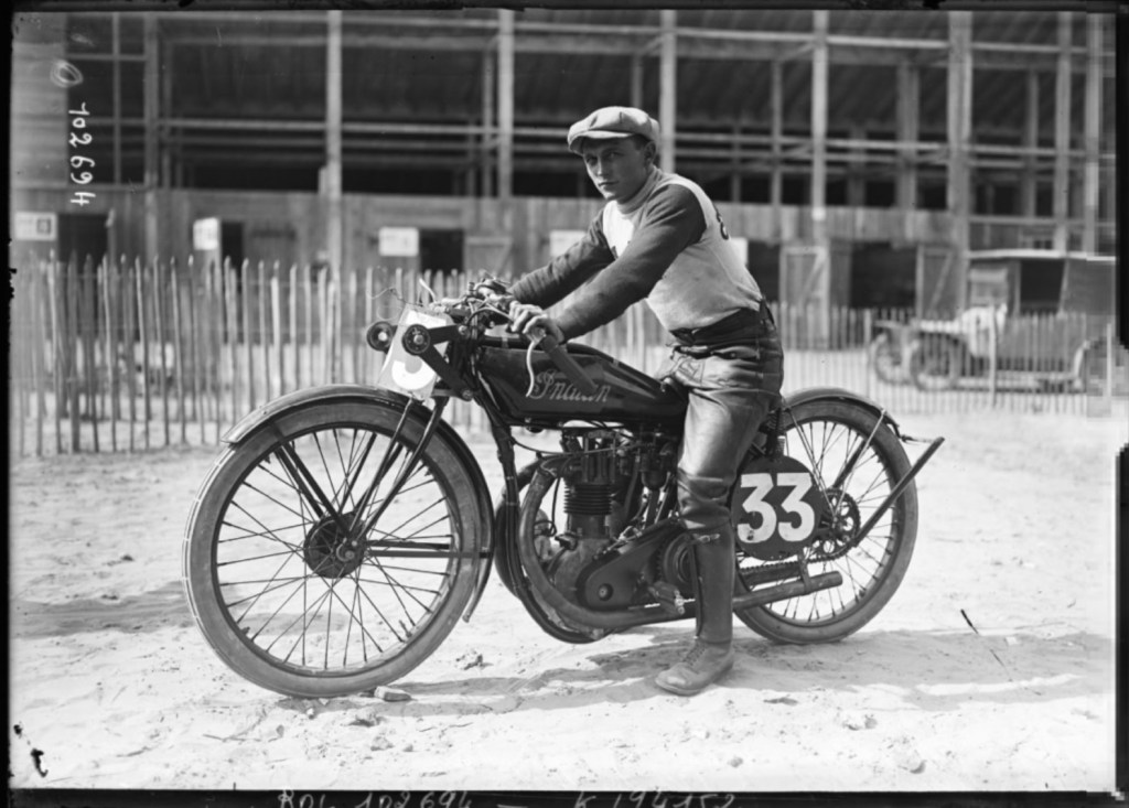 Indian Altoona 8-valve racer (unattributed)Altoona Speedway, grid of the Fall Classic in September 1924. Front left Ernie Ansterburg, Duesenberg, #16 Ray Cariens, Miller and #3 Bennet Mill in another Miller. Four Indy winners contested this race – look at that crowd! – Tommy Milton, Jimmy Murphy (who won the Classic), Joe Boyer and Peter DePaolo (Paul Sheedy Collection via firstsuperspeedway.com)Indian factory rider, Paul Anderson (who raced in Australia over the 1924-25 summer) aboard a 500cc, four-valve, single-cylinder 1924 road racer at Montlhery in 1925. Frame is “a full-loop design like Indian’s board-track racers, and a front brake 3 years before other Indians got them,” wrote The Vintagent (Bibliotheque Nationale de France)