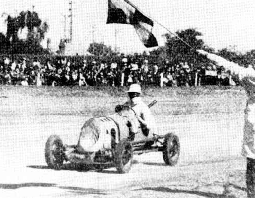 Balgarnie takes the chequered flag to win the 1937 Australian Midget Championship at Penrith New South Wales. Make of chassis and engine would be a bonus? (Western Mail)