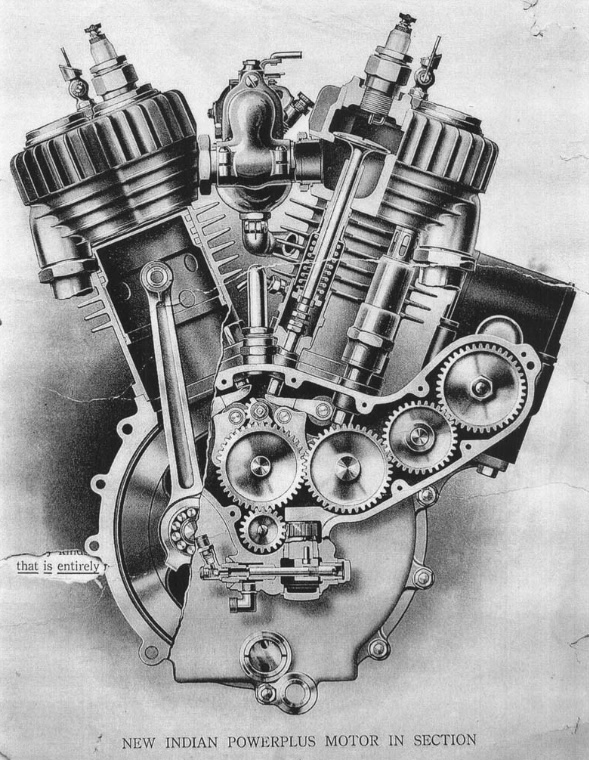 Gene Walker on a factory Indian Powerplus 61cid, at Ormond Beach, Daytona in April 1920. Walker and fellow rider Herbert McBride collected 24 US and international records on this sortie to the Daytona speed coast. “Walker performed so well onboard his newly configured side-valve machine – with its distinctive finned exhaust ports seen in this photo – that the setup became known as the ‘Daytona’ motor, a legend in American racing circles” wrote (archivemoto.com)Indian Powerplus 1-litre side-valve Vee-twin cutaway. Designed by Charles Gustafson and refined and developed by Charles Franklin (unattributed)