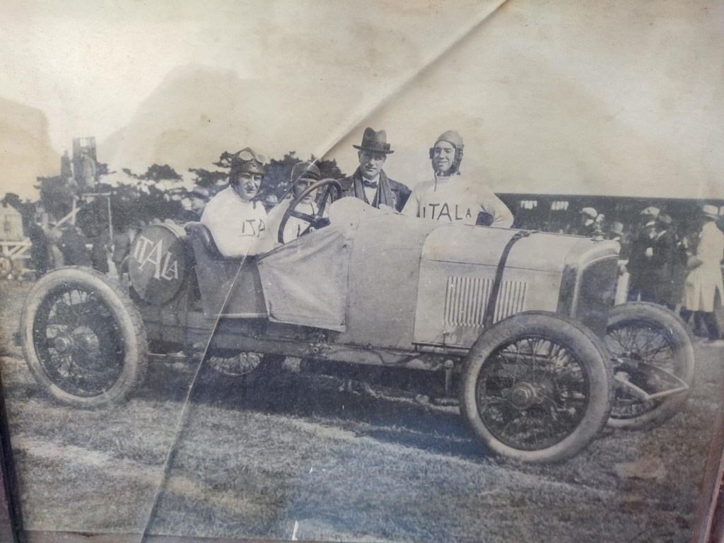 Turner’s Itala racing a Farman bi-plane, probably piloted by Major Harry Shaw – a prominent racer himself – at Aspendale circa 1921, it was a dead-heat apparently. Exact date appreciated.