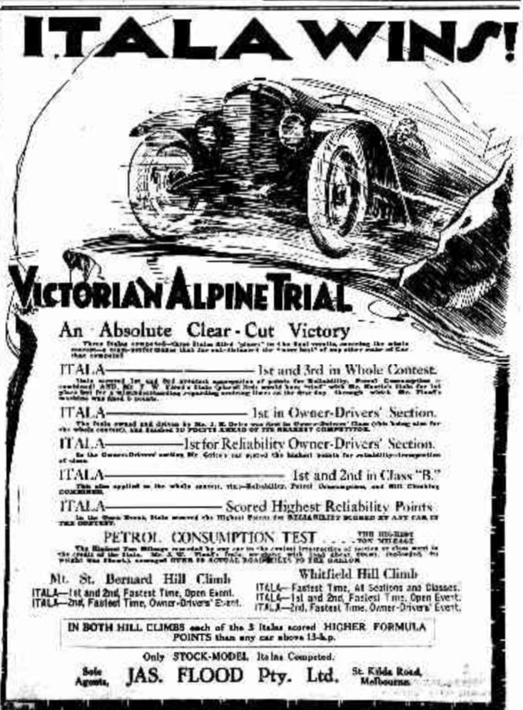 The Turner Itala is variously described in contemporary newspaper reports as a 17.9hp or 15hp Floria (sic), it’s perhaps a 2.8-litre, four cylinder 55bhp @ 3200rpm engined Type 51 Sport with a Targa Florio style body, built by James Flood in Melbourne. Details of the car from a marque expert appreciated, inclusive of present whereabouts.