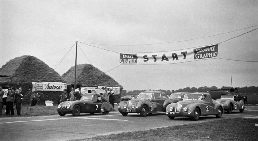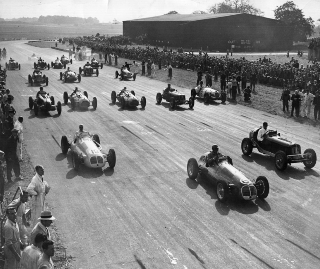 At the jump, local boy Reg Parnell is fast away in his 4CLT/48 from grid 7, Peter Walker’s ERA B-Type at right and Bira’s Maserati 4CL on the left.