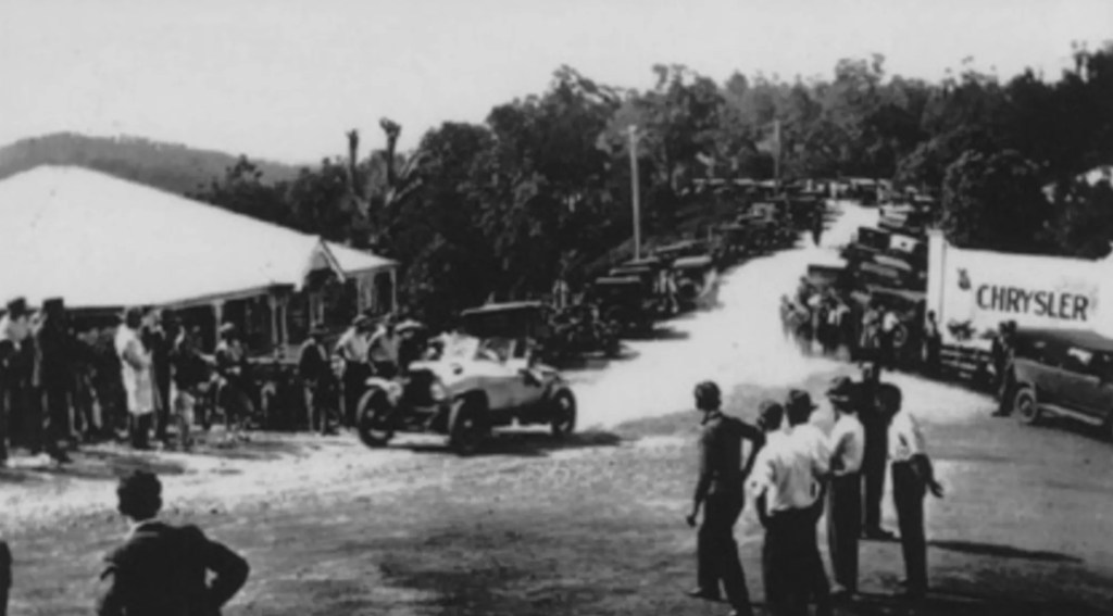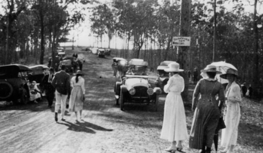 Henry Horstman and Maldwyn Davies – Queensland Bugatti importer – on the way to FTD in the RACQ hillclimb at Mount Coot-tha on April 1, 1928, Bugatti T37. His time of 1 min 20 sec was eight seconds clear of the rest of the field (speedwayandroadracehistory.com)Folks take in the Mount Coot-the sun, circa 1920 (alamy)