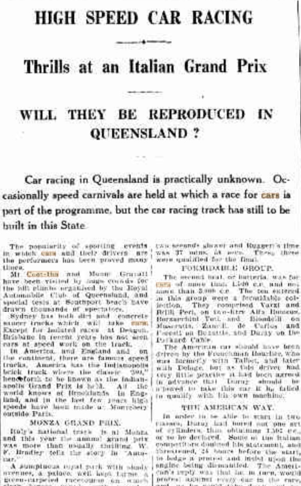 “Car racing in Queensland is practically unknown. Occasionally speed carnivals are held at which a race for cars is part of the programme, but the car racing track has still to be built in this state,” said the motoring reporter of Brisbane’s The Telegraph on November 5, 1929.