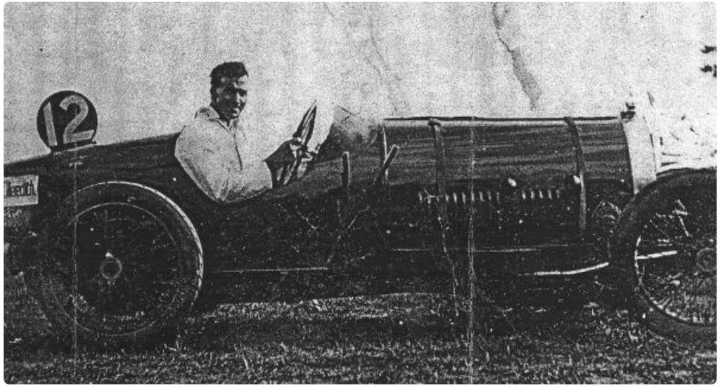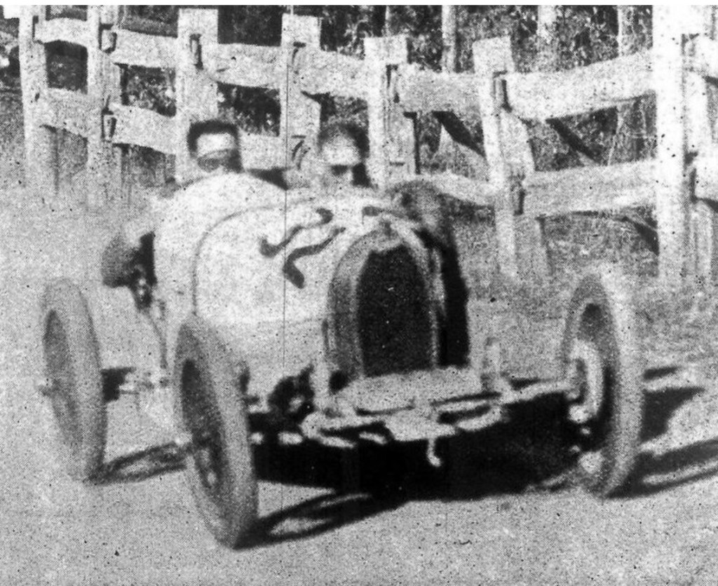Geoff Meredith aboard the Bugatti T30 in which he won the speedway style 1927 AGP at the Goulburn Racecourse (Goulburn Post)