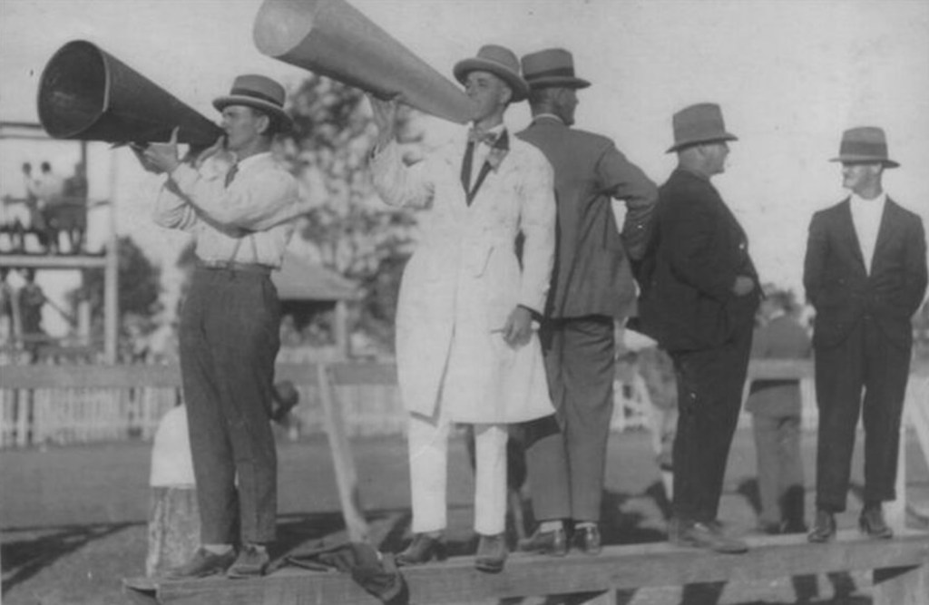 Deagon Speedway commentators doing it the hard way in the mid-1920s. I wonder if hats will ever make a comeback?