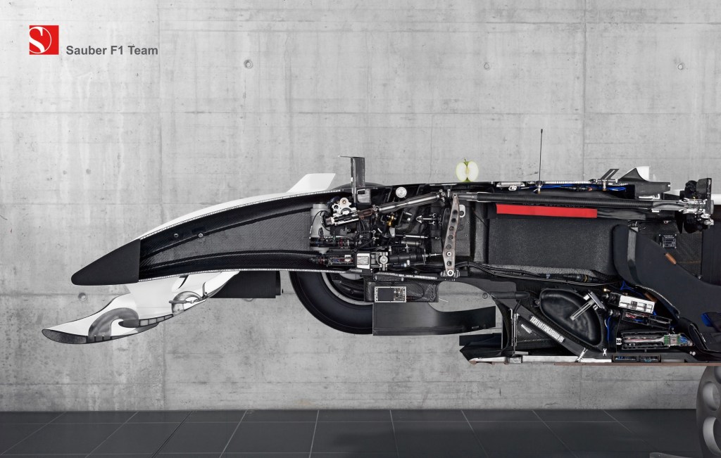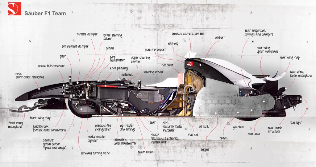 The idea to slice and dice a Sauber F1.08 – chassis F1.08-2 – was ex-Sauber man Sergio Bonagura’s idea in 2009. It’s a powerful way of getting a handle on the packaging and technology of modern’ish F1 cars. It took team mechanics two years to prepare the exhibit, by spring 2012 the project was complete.
