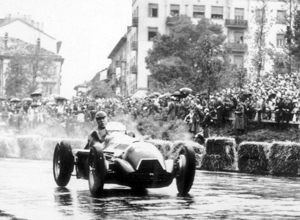 Wimille on the way to a very soggy win at Valentino Park, Turin in September 1948. He won the Italian Grand Prix from Gigi Villoresi, Maserati 4CLT/48 and Raymond Sommer’s Ferrari 125.