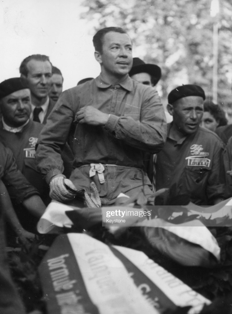 Jean-Pierre Wimille during the GP des Nations, Geneva over the July 21, 1946 weekend. He won his heat, so too did Giuseppe Farina his, and the final. Carlo Trossi was second and Wimille third, all aboard 158s (Getty-Klemantaski)Wimille and the Alfa Corse crew after winning the 1947 Swiss GP at Bremgarten