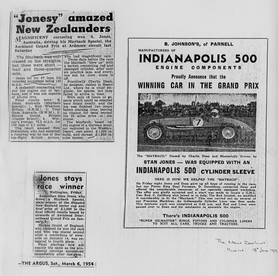 Jones looking pretty happy with himself after the Ardmore victory. It had been a tough few days for all of the team dealing with major mechanical recalcitrance of the big Maybach six, note the company logo on Stan’s helmet.