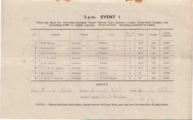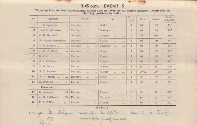 “The entry for the 500cc race. This was Moss’s second circuit race. He won (below) by over 30 seconds, not bad for a 10 lap, 12.2 miles race! I think that PA Collins is Peter’s father but he didn’t start the race.”