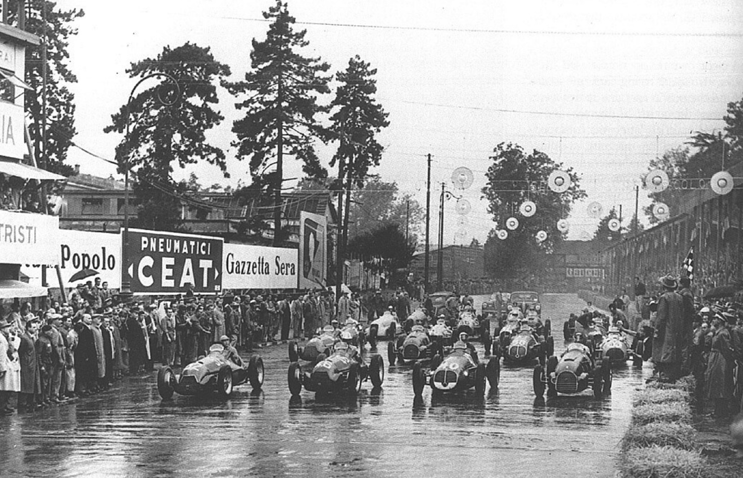 The off at Turin, the front row is L>R J-PW and Carlo Trossi’s Alfa 158, Villoresi’s Maserati and Sommer’s Ferrari.