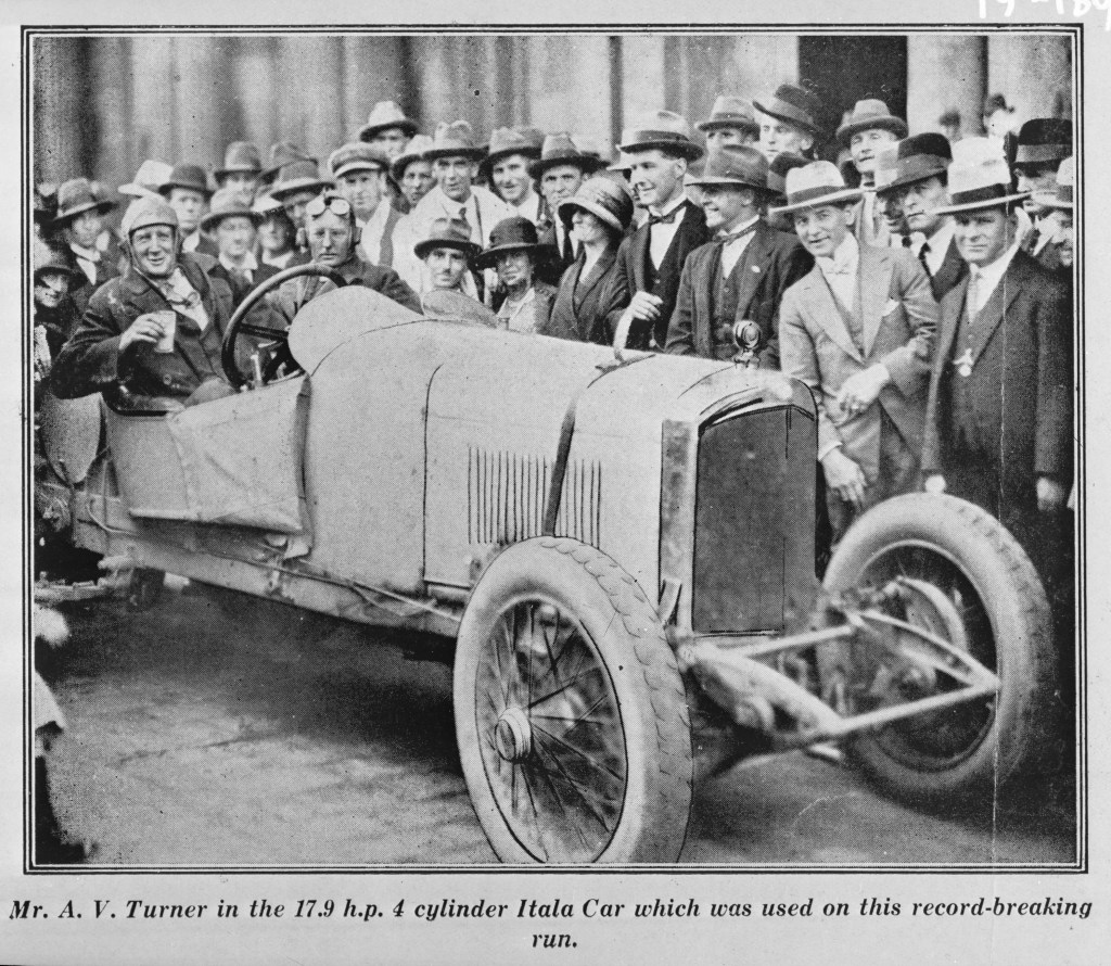 AV Turner at Aspendale, Melbourne, a banked dirt track, on the way to winning the “blue riband 25-miles Australian Championship” from Carlo Massola’s Diatto on April 21, over the Easter 1924 long weekend (hyperracer.com)(SLV)Turner and somewhat energetic crew – perhaps that fella has had enough? – during their victorious 1921 Alpine Trial run. Itala Tipo 51 tourer powered by a 2.8-litre, two side-valve 50bhp @ 3000rpm four cylinder engine. Four speed ‘box (melbournecircle.net)