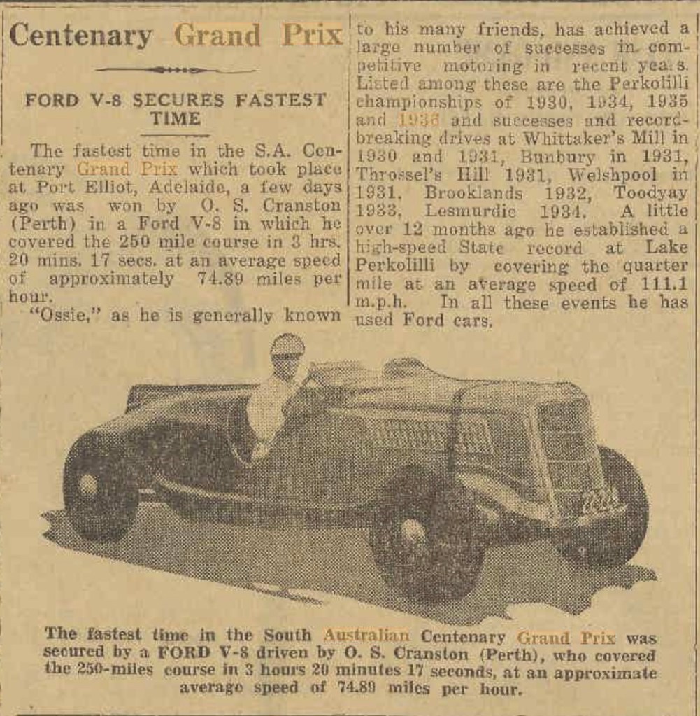 After success in the South Australian Centenary Grand Prix, held at Victor Cranston told the Motorist and Wheelman that he was retiring from racing because he was “too old”.