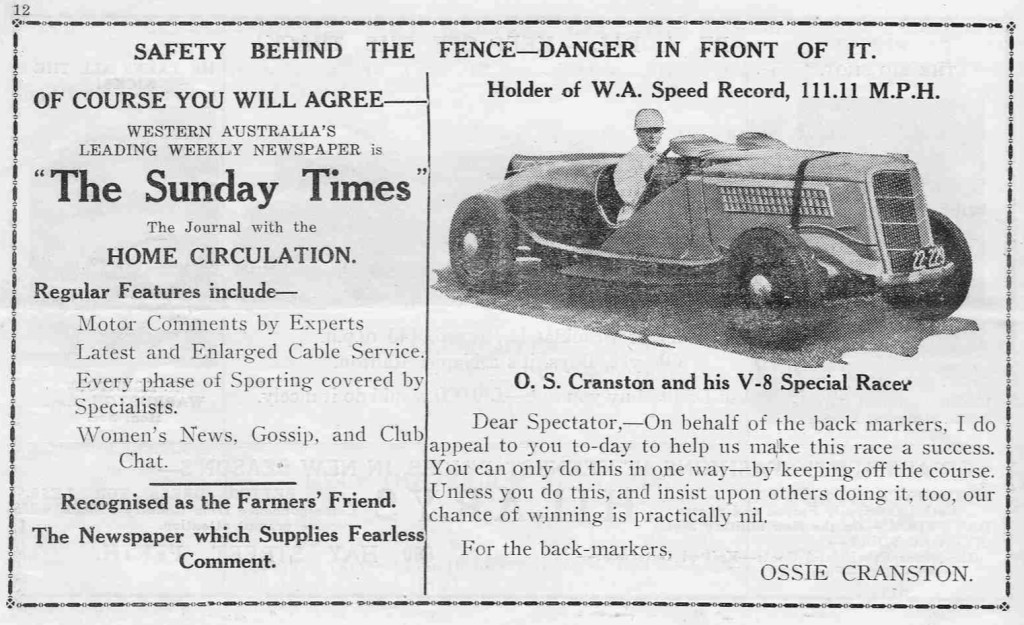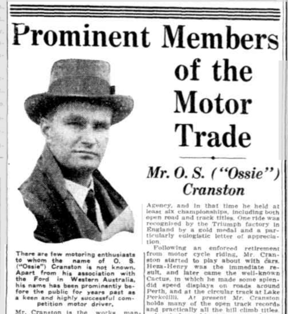 Ossie remained involved and close to motorsport. An Ossie Cranston Trophy was contested in West Australian Sporting Car Club events for years, Cranston was a stalwart of the club, formed on November 17, 1929. Together with Eric Armstrong, CS Dyer and Claude McKinley he kept the very successful organisation together in some of its more difficult years.
