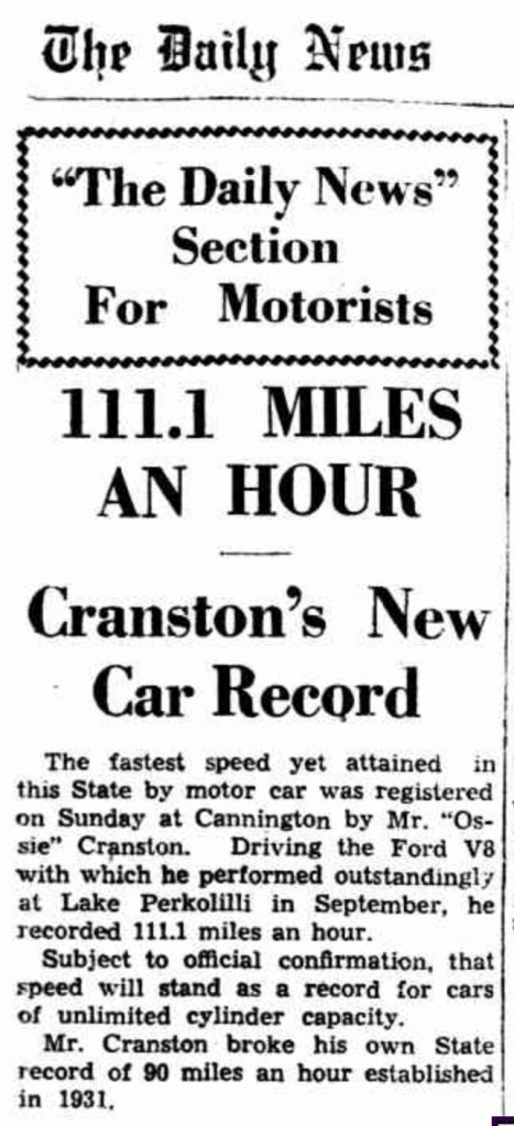 In 1934 Cranston returned to racing with the Ford V8, setting a new Australian record at Perkolilli over 10 miles (16 kilometres) at an average speed of 97.61mph (157 km/h), and later a new State record of 111.1mph (178.8km/h) over a flying quarter-mile on Nicholson Road, Cannington, beating the record set in the Model-A.