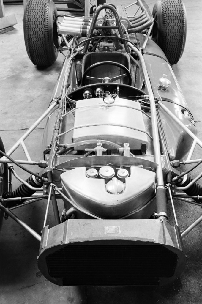 BT12-1 in build at Motor Racing Developments, Weybridge, Surrey circa April 1964. Long-stroke, 4128cc, 420bhp @ 6600rpm Offy sits tall in the frame, Colotti-Francis GSD transaxle and inverted lower wishbone, single top link, two radius rods and coil spring/shocks, rear discs, knock on hubs and beefy driveshafts all clear (MotorSport)Spaceframe chassis, upper and lower wishbone/coil spring-shock and roll bar suspension. Note the bungee’d in place oil tank and top-of-chassis little fuel tank. Note too the main tanks offset to keep the bulk to the inside. About 59 gallons of fuel when full (MotorSport)Indy 1964 (MotorSport)