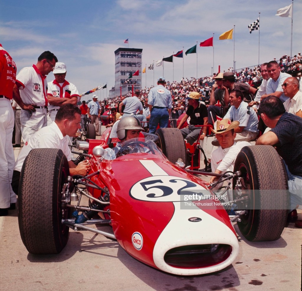 Brabham ready to boogie aboard the Zinc Trackburner Special on raceday at Indianapolis in 1964.