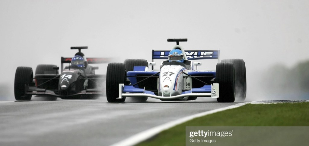 Hans Stuck and Patrick during the GP Masters round at Silverstone in August 2006. Stuck was fourth and PT 11th in the race won by Eddie Cheever.