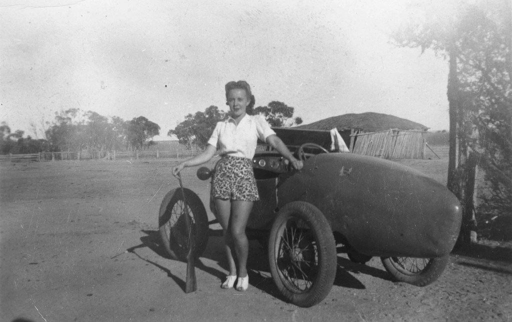 The thoroughly delightful Eunice Fidock is shown beside an Austin 7 Special at Dowerin, Western Australia circa 1935.