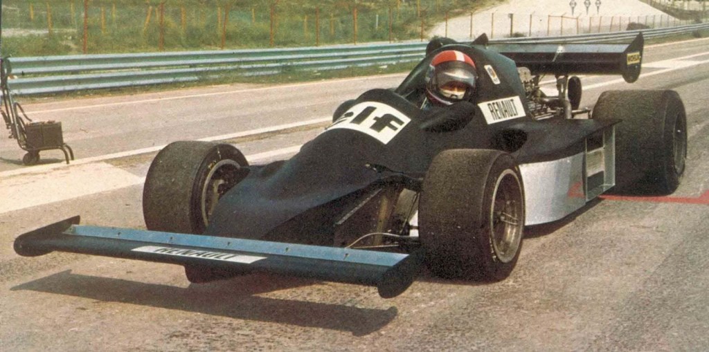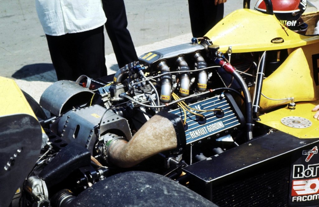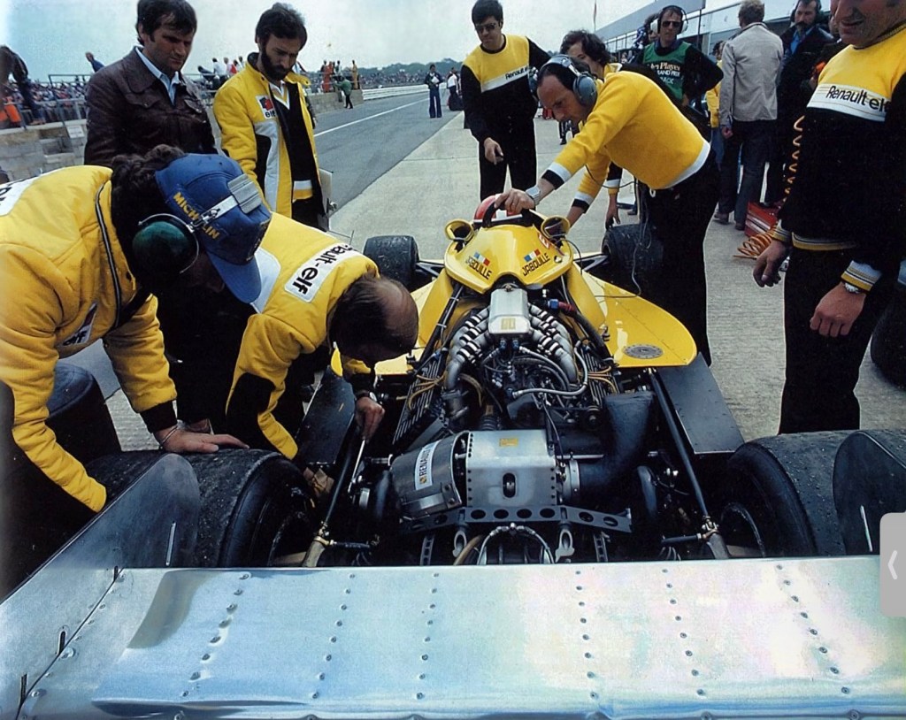 Three photographs during the 1977 British GP weekend at Silverstone. JPJ, Renault RS01 Q21 and DNF lap 17 with turbo failure. Race won by James Hunt’s McLaren M26 Ford from Niki Lauda’s Ferrari 312T2 and Gunnar Nilsson, Lotus 78 Ford (MotorSport)(Twitter)Renault Gordini EF1 1492cc single Garrett-turbocharged 510bhp @ 11000rpm engine (MotorSport)