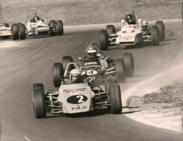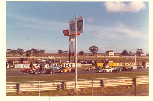 Quite possibly the Calder meeting at which Perkins T was photographed in the opening shot in 1973, a mixed FF and ANF3 grid, common in the day. I’ll take advice on who most of the cars/drivers are but it appears to be a red Elfin 600 and a Wren on the front row. That’s Terry on row 2 in car #2 Elfin 620 whilst on row 3 on the far side is, I think, Peter Larner whilst the white #78 is Brian Sampson’s Cheetah Mk3 Toyota-unusually far back (unattributed)