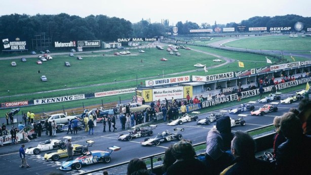 Huge Brands grid 21 October 1973. Ian Taylor, March #1, Tony Brise alongside and Michel Leclere Alpine on the outside. #25 is Alan Jones GRD 372, #4 Masami Kawashima and #61 Larry Perkins, white Brabham BT41 Ford on the inside and the rest. Brise won from (K Hyndman)