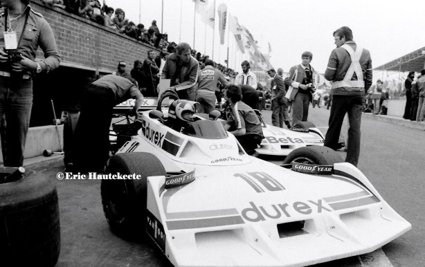 Andersson’s BRM P207 in slight undress at Spa in 1977- front inboard rocker suspension clear, DNQ