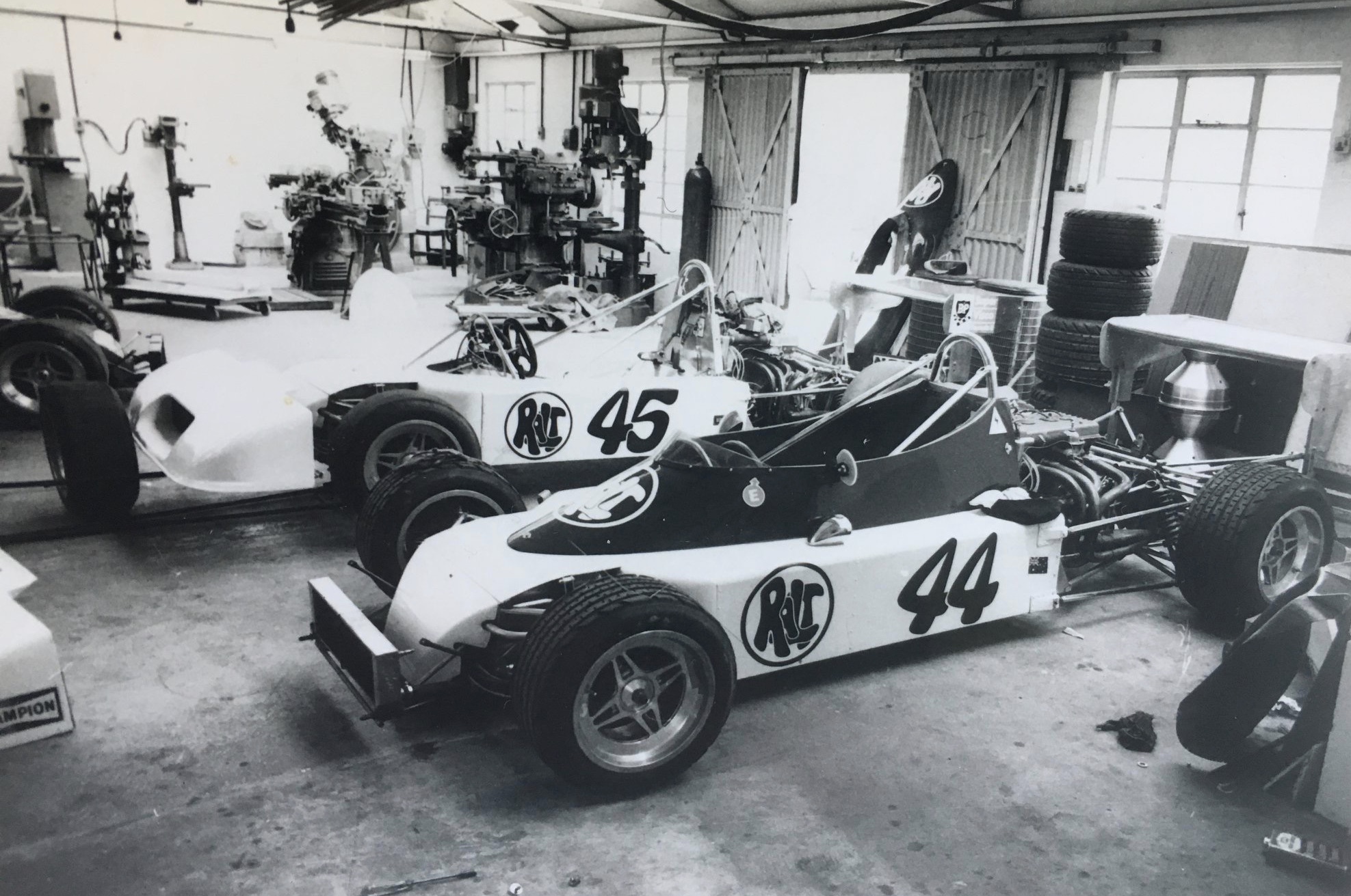 The two Perkins brothers Ralt RT1’s in the Ralt, Snelgar Road Woking factory in early 1975. #44 Larry, chassis # ‘RT1/75-2’ and Terry # ‘RT1/75-3’ (G Siddle)