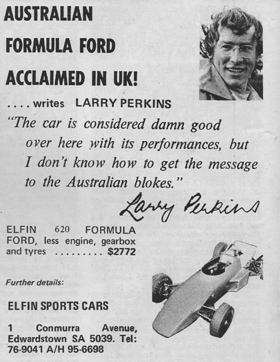 Elfin Racing Car News ad extolling the virtues of the Elfin 620. Larry took the first chassis to England having won the 1971 FF Driver to Europe award in one of Bib Stillwell’s Elfin 600s