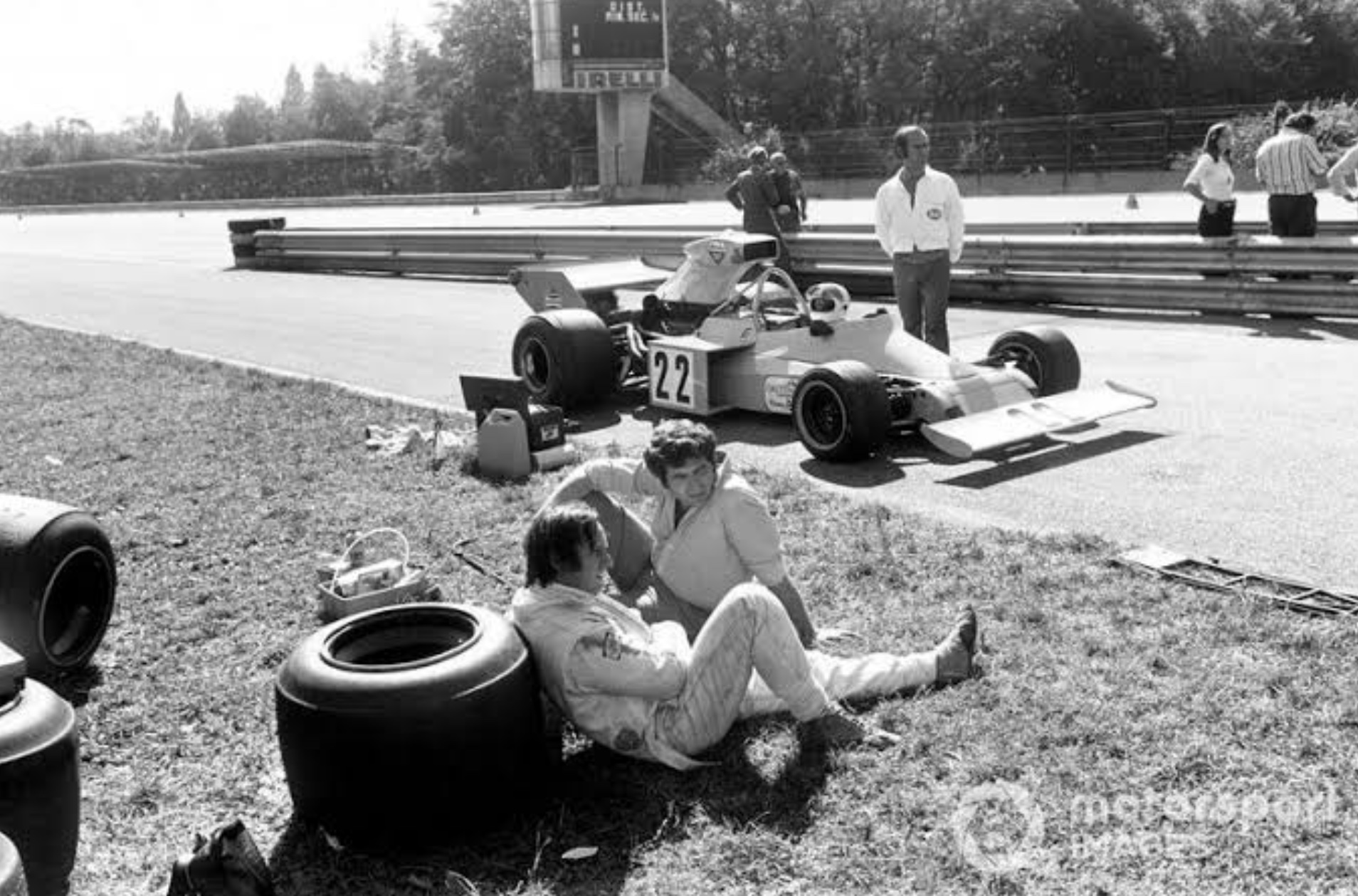 Chris Amon and the boys chew the fat at Monza during the Italian GP weekend in September 1974.