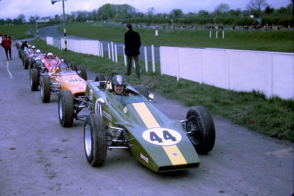 Quite possibly the Calder meeting at which Perkins T was photographed in the opening shot in 1973, a mixed FF and ANF3 grid, common in the day. I’ll take advice on who most of the cars/drivers are but it appears to be a red Elfin 600 and a Wren on the front row. That’s Terry on row 2 in car #2 Elfin 620 whilst on row 3 on the far side is, I think, Peter Larner whilst the white #78 is Brian Sampson’s Cheetah Mk3 Toyota-unusually far back (unattributed)