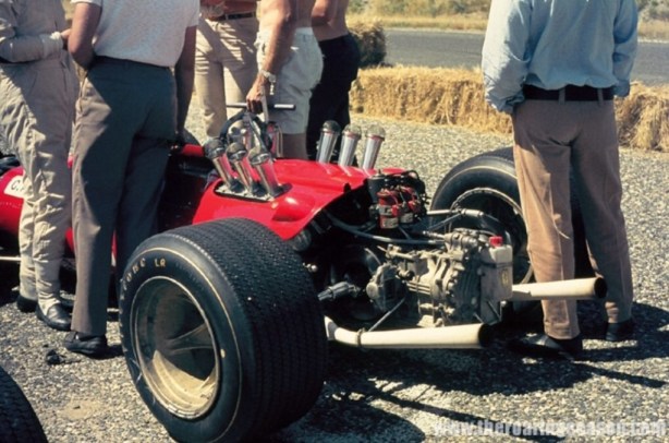 The business end of Lorenzo Bandini’s Ferrari 158 during practice.