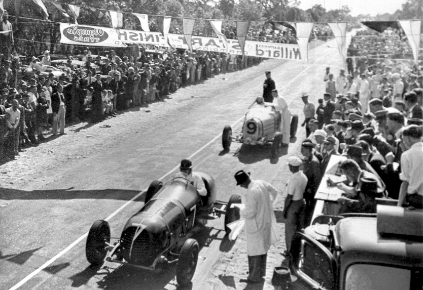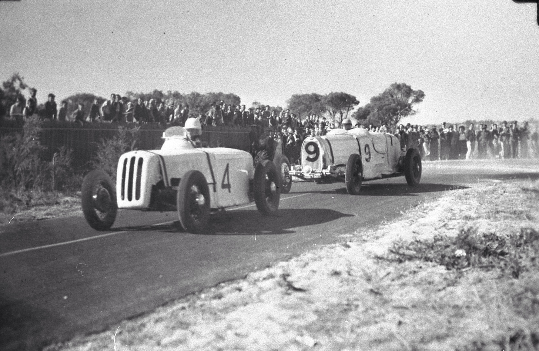 Huge crowd awaits the start of the Patriotic Grand Prix at Applecross in 1940. Clem Dwyer’s very successful Plymouth Special in front of Duncan’s T57T.