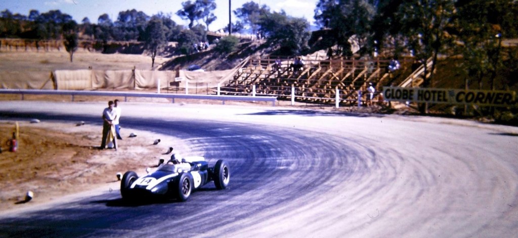 The photograph above is Paul England’s Ausca Holden-Repco which contested the 25 November, 34 lap, 100 mile Australian Tourist Trophy. He was 12th outright and second in class, in the car he and Bill Hickey built after hours at Repco Research’ Sydney Road, Brunswick premises on the other side of town. The flash of blue to the right is the Norman Hamilton owned Porsche 550 Spyder driven that weekend by Otto Stone, lasting only one lap. Otto would have been a busy boy that fortnight, looking after Stan Jones’ 250F, or was he preparing it at that early stage?