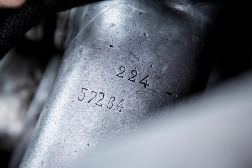 The only replica mechanical parts used in 57264’s rebuild are the rear-brake back plates, the brake cross shafts and the dashboard instruments while original parts being sold with the car but not used in the rebuild include gearbox internals, crankshaft, cylinder block, steering wheel, steering drag link, oil pump, Stromberg carburettor – two SUs are mounted presently on the original manifold – while in addition there is a spare radiator ex-Sandford-Morgan.”