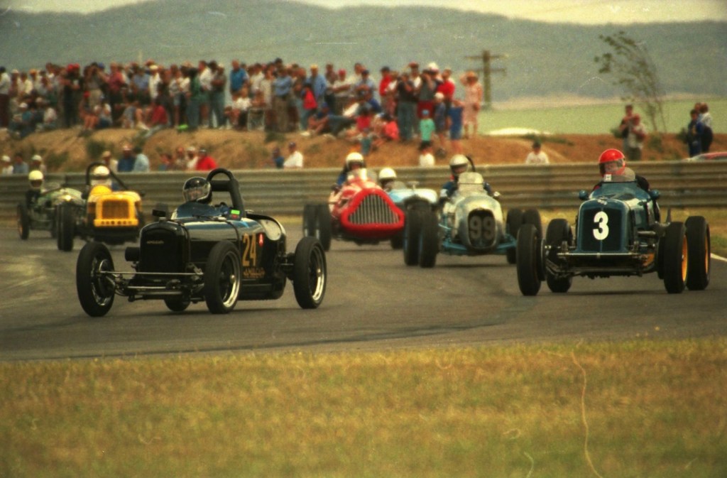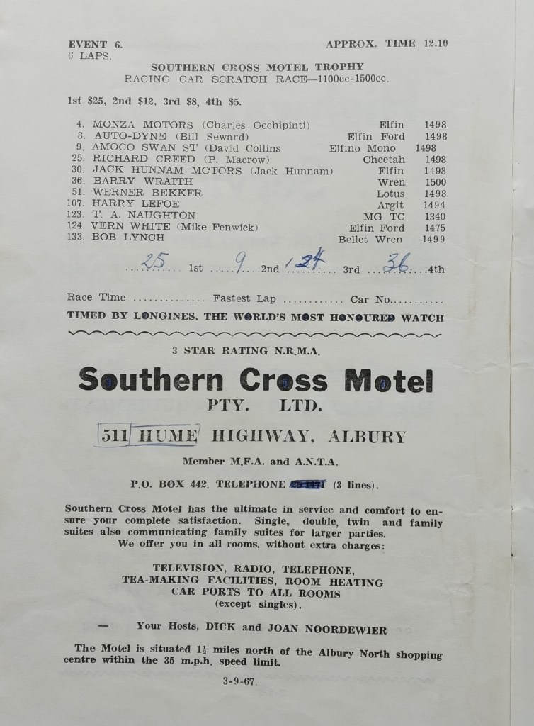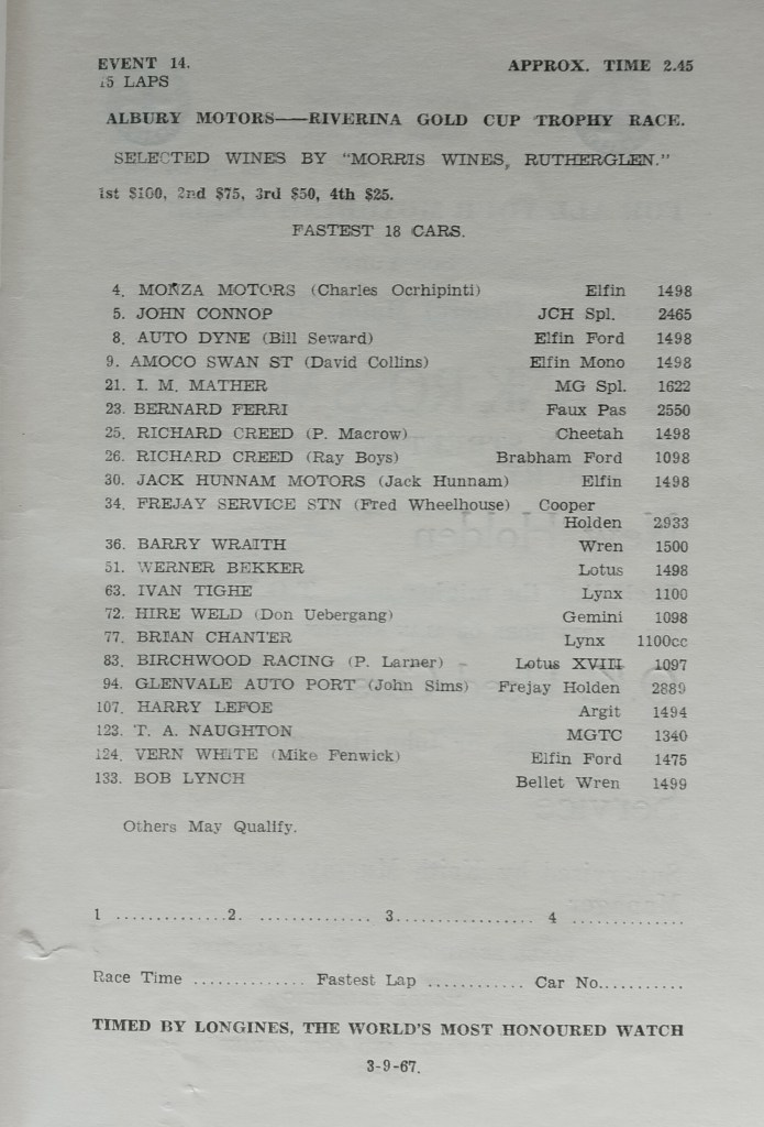 It was his third Riverina Gold Cup on-the-trot! He won from a 17 car field varying in performance from future prominent Clubman and Tourer competitor Tom Naughton’s MG TC and equally capable single-seater driver/engineers Ivan Tighe, Lynx and Peter Larner, Lotus.