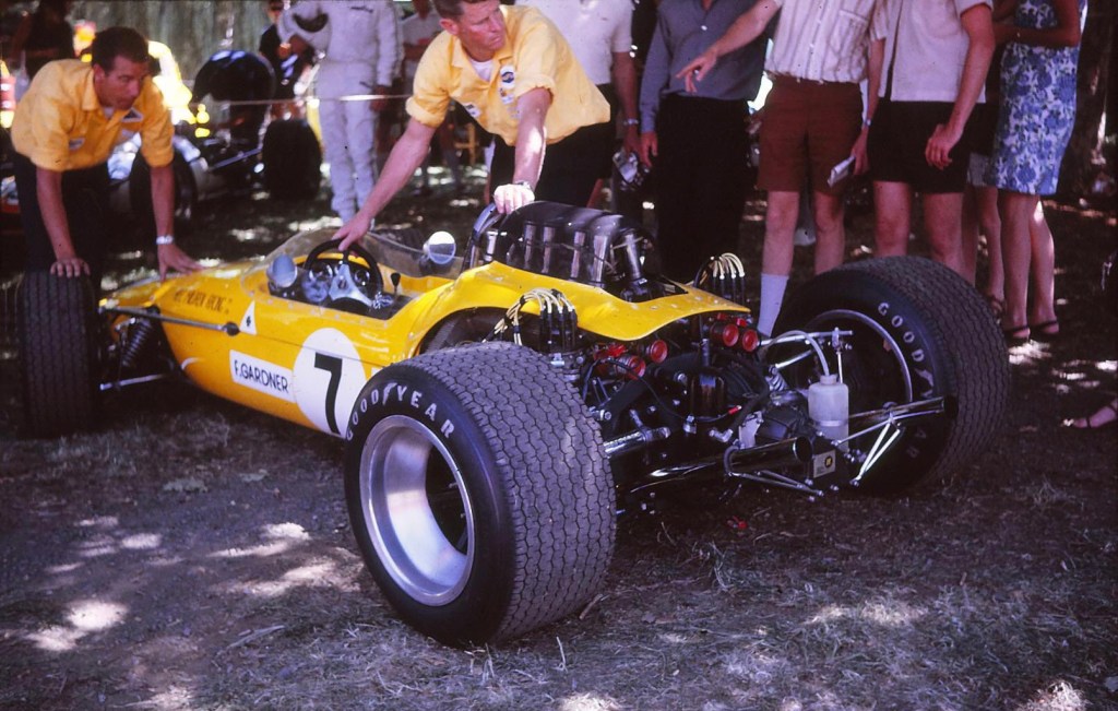 Repco Brabham V8 engined Brabhams for Jack (in Australia) and Leo Geoghegan’s Lotus 39, BRM V8s and V12s – the P261 and new P126, the V6 Ferrari 246T and of course the Ford DFW V8 in the back of Jim Clark and Graham Hill’s Lotus 49, the 1.6-litre Ford FVA powered Brabham BT23 raced by Denny Hulme and Piers Courage’s McLaren M4A FVA. Not to forget Frank Gardner’s one-off Alec Mildren owned Brabham BT23D powered by a 2.5-litre variant of Alfa Romeo’s sportscar Tipo 33 V8. Plus the 2.5-litre FPF Climaxes, so long the backbone of the series. We never had it so good! Vive Le difference
