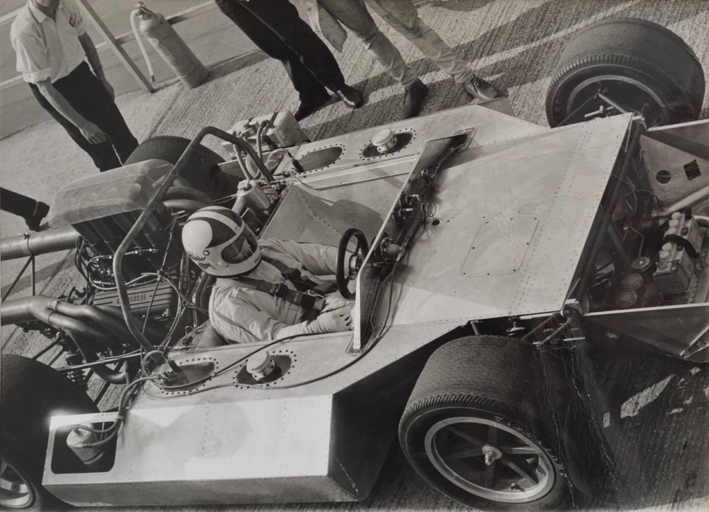Here the machine is sharing the grid with another legendary car, the Lycoming Special – in which Jim Clark did some laps one year – with Jim Boyd at the wheel, the flash of red at right is the Stanton Corvette raced by Geoff Mardon.