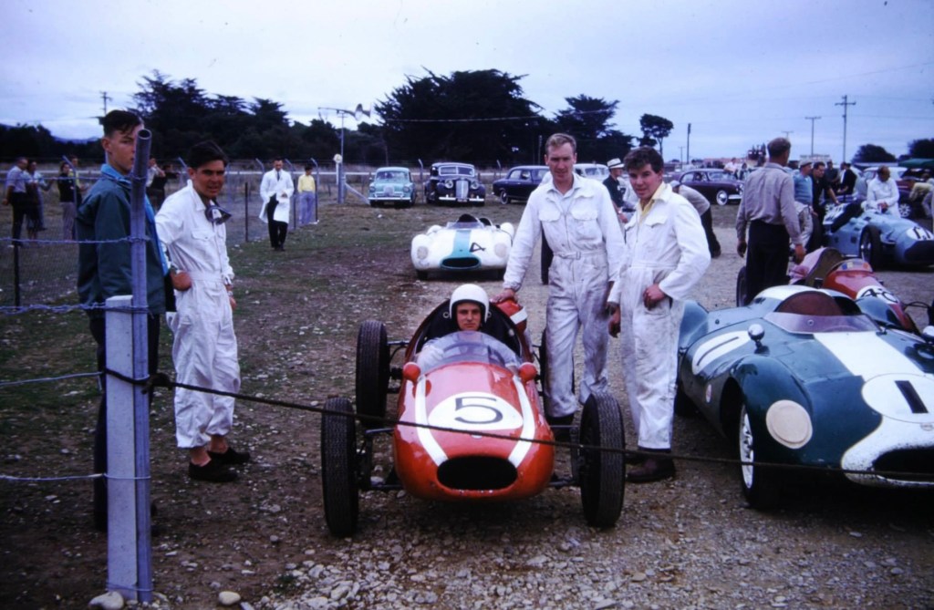 Coopers galore in NZ circa 1961, circuit folks? Chris aboard his Cooper T41 Climax with Bruce’ hand on rear body (B Wilson Collection)