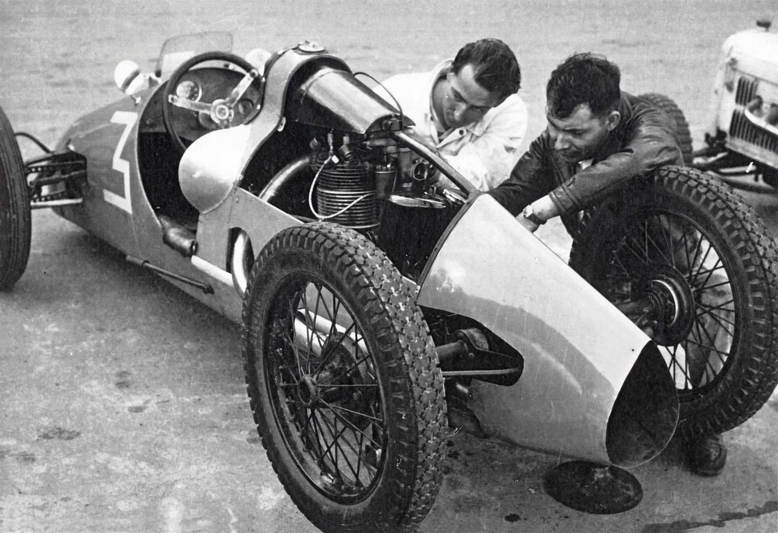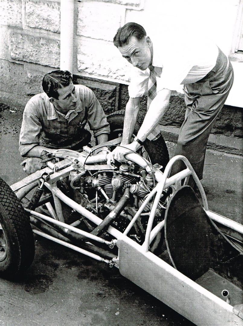 Otto Stone working on an MG Q-Type with Verna Davey-Milne looking on. Stone was another life-long competitor/engineer with influence across the sport not least preparing – and calming down a bit – Stan Jones and his Maserati 250F to AGP and Gold Star victories.