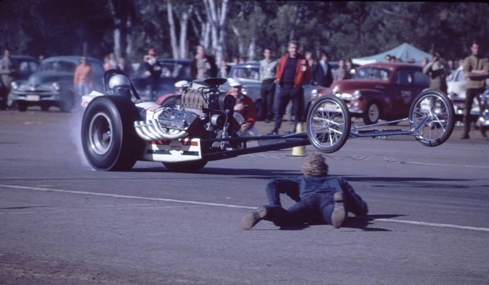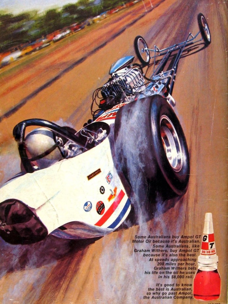 Graham Withers ‘slingshot’ Ampol GT sponsored dragster/rail at Castlereagh in 1968.