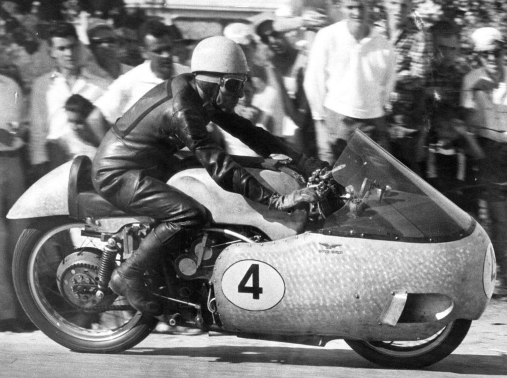 Ken Kavanagh aboard the awesome Moto Guzzi 500 V8 GP machine during the 1956 Senigallia Grand Prix.