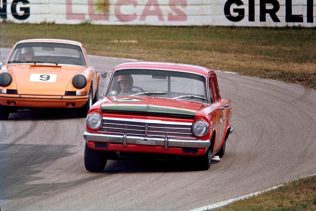 This is the Queensland Touring Car Championship meeting at Surfers Paradise in August 1969, a round of the Australian Touring Car Championship. Dick Johnson’s EH Holden in front of Alan Hamilton’s Porsche 911