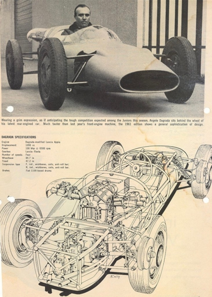 With the announcement of Formula Junior in 1958 the floodgates opened to chassis builders from around the globe using 1100c BMC, Fiat, Ford, Renault and Lancia engines. The latter provided one of the loudest, potent engines to ten or so front and mid-engined cars built by Milanese mechanic, Angelo Dagrada.