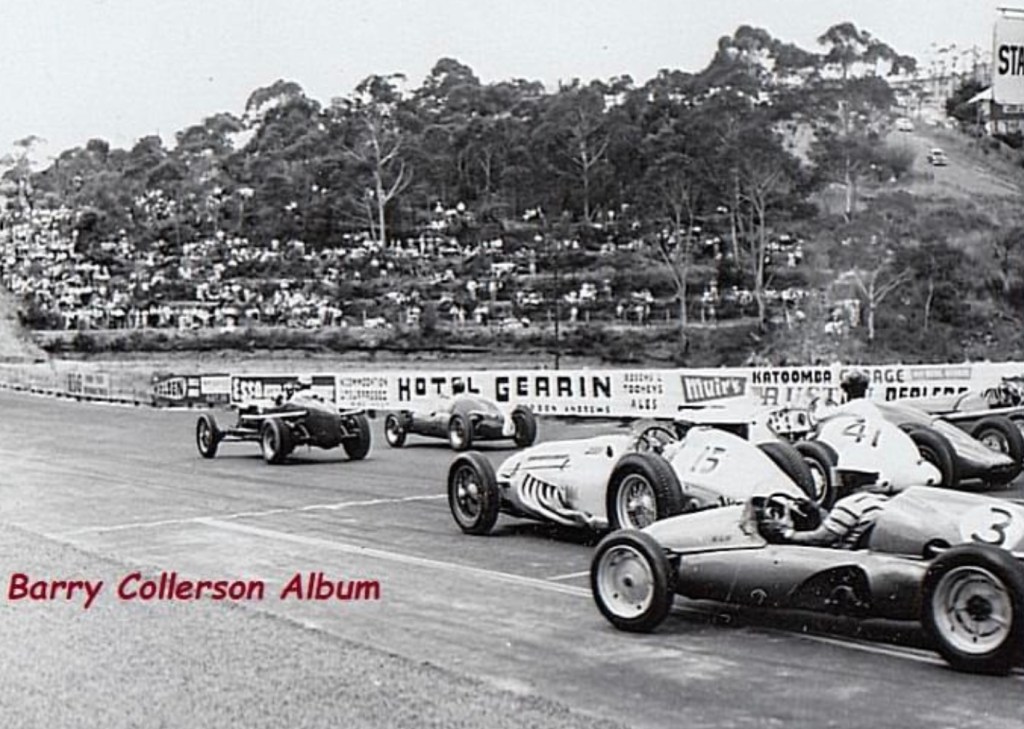 Ray Walmsley, Alfa Romeo P3 Chev up front, with Jack Myers’ #3 Triumph Thunderbolt, Barry Collerson, Talbot Lago T26C #15, #41 Frank Walters, SoCal and Gordon Stewart, Stewart MG at the start of a Catalina Park race during the opening meeting in 1961