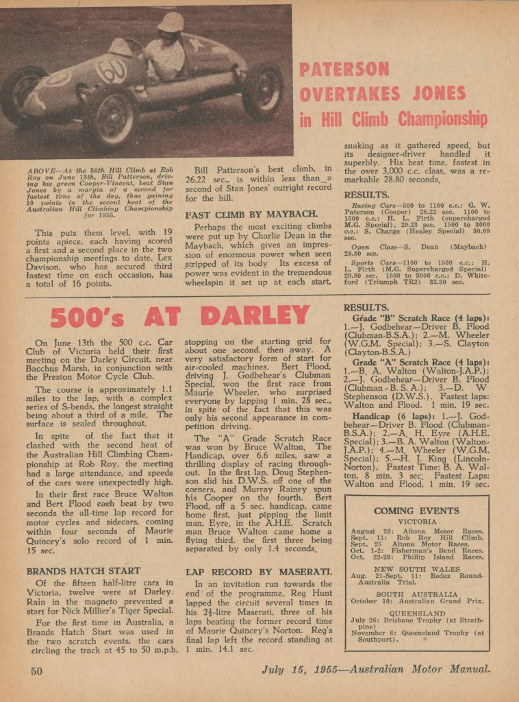 When Jack Brabham raced his midget at Rob Roy post-war he had the same problems but went to Sydney, fitted some brakes to his car, and returned to take the Australian Hillclimb Championship at Rob Roy in 1951. Up yours Blue Blazer Officialdom, or something like that!